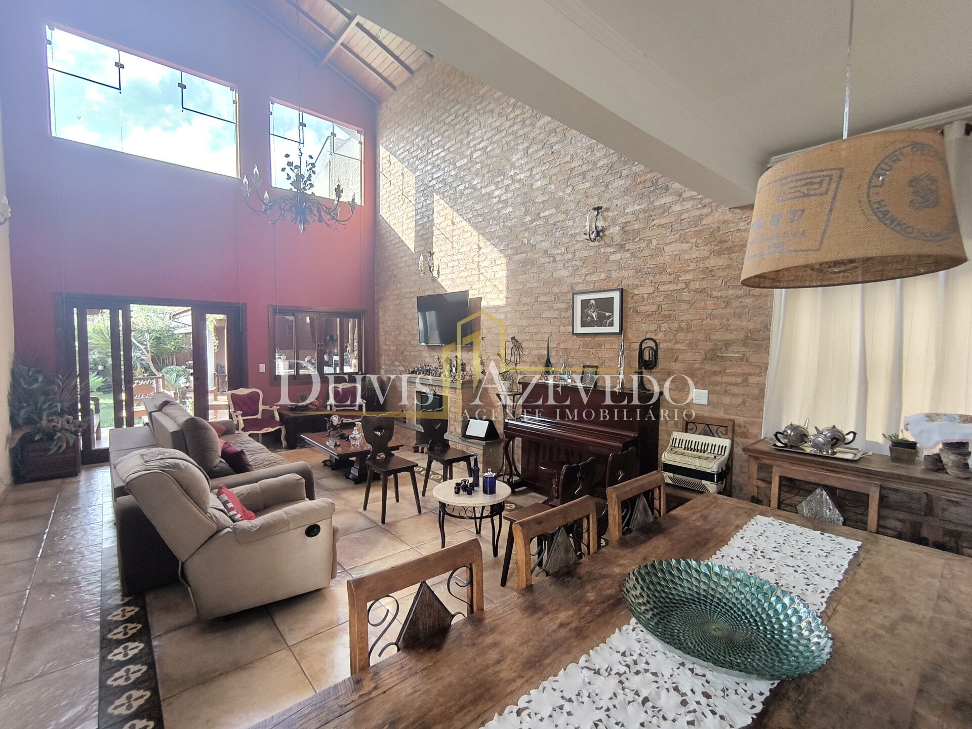 Sala de estar com lareira e pé direito duplo